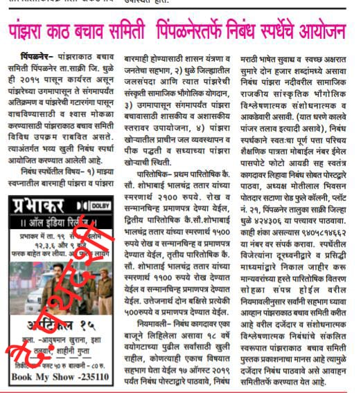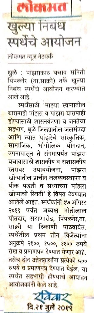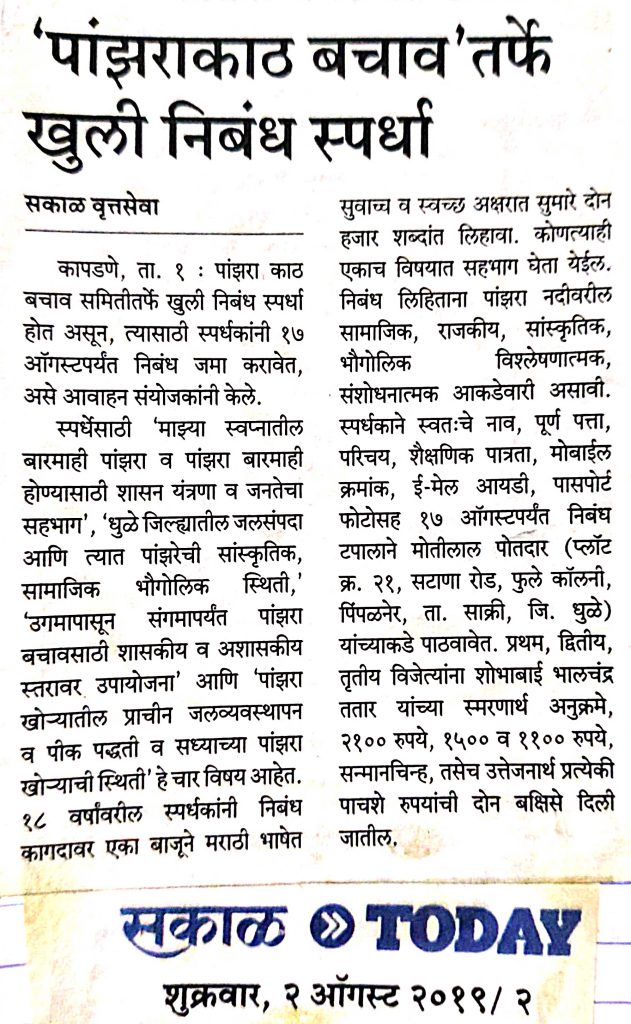 पांझराकाठ बचाव समिती पिंपळनेर ता.साक्री जि. धुळे ही 2015 पासून कार्यरत असून पांझरेच्या उगमापासून ते संगमापर्यंत अतिक्रमण व पांझरेची गटारगंगापासून वाचविण्यासाठी व श्‍वास मोकळा करण्यासाठी पांझराकाठ बचाव समिती विविध उपक्रम राबवित असते. त्याअंतर्गत भव्य खुली निबंध स्पर्धा आयोजित करण्यात आली होती.