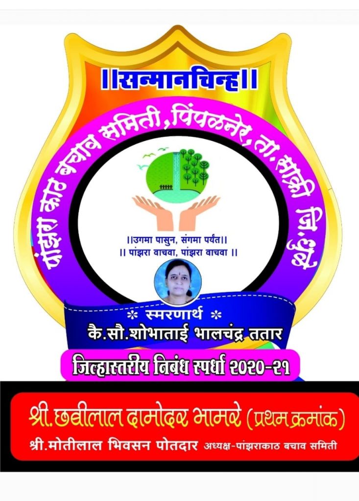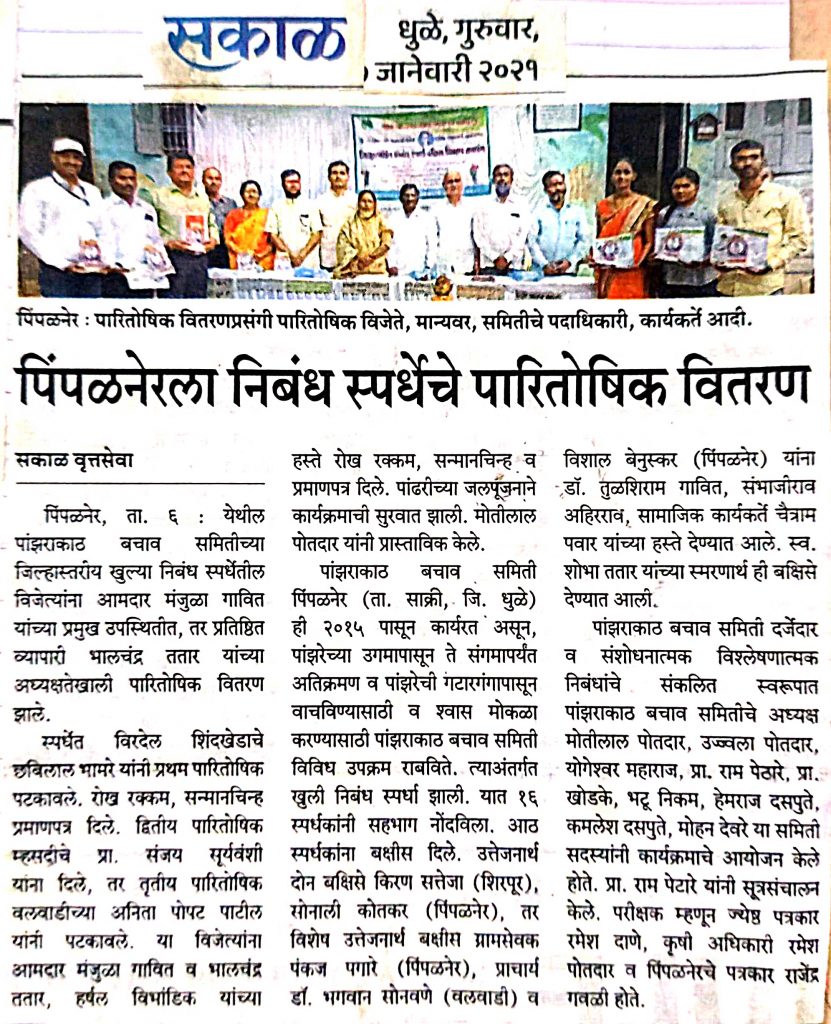जिल्हास्तरीय खुल्या निबंध स्पर्धेतील विजेत्यांचा पारितोषिक वितरण कार्यक्रम आमदार सौ.मंजुळा गावित यांच्या प्रमुख उपस्थितीत तर प्रतिष्ठित व्यापारी भालचंद्र ततार यांच्याअध्यक्षतेखाली घेण्यात आला.या स्पर्धेत विरदेल शिंदखेडाचे छबिलाल दामोदरदास भामरे यांनी प्रथम पारितोषिक पटकावले. रोख रक्कम, सन्मानचिन्ह प्रमाणपत्र देण्यात आले. द्वितीय पारितोषिक  म्हसदीचे प्रा.संजय वेडू सूर्यवंशी यांना देण्यात आले. तर तृतीय पारितोषिक वलवाडीच्या अनिता पोपट पाटील यांनी पटकावले. या विजेत्याना आमदार सौ.मंजुळा गावित व भालचंद्र ततार, हर्षल विभांडीक यांच्या हस्ते रोख रक्कम, सन्मानचिन्ह व प्रमाणपत्र देण्यात आले. उत्तेजनार्थ दोन बक्षिसे कु.किरण रवींद्र सत्तेजा शिरपूर, सोनाली प्रशांत  कोतकर, पिंपळनेर, तर विशेष उत्तेजनार्थ बक्षीस ग्रामसेवक पंकज हिराजी पगारे(पिंपळनेर ) , प्राचार्य डाॅ.भगवान सोनवणे, (वलवाडी) व विशाल  बेनुस्कर पिंपळनेर यांना डाॅ.तुळशिराम गावित, संभाजीराव अहिरराव, सामाजिक कार्यकर्ते चैत्राम पवार यांच्या हस्ते देण्यात आले. सर्व विजेत्याना रोख रक्कम, स्मृतीचिन्ह, प्रमाणपत्र व मानाचे वस्र स्व.सौ.शोभाताई भालचंद्र ततार यांच्या स्मरणार्थ देण्यात आले. पांझराकाठ बचाव समिती दर्जेदार व संशोधनात्मक विश्लेषणात्मक निबंधांचे संकलित स्वरूपात पांझरा काठ बचाव समितीचे अध्यक्ष मोतीलाल पोतदार, सौ.उज्ज्वला पोतदार, यांनी या कार्यक्रमाचे आयोजन केले होते. कार्यक्रमाचे सूत्रसंचालन प्रा.राम पेटारे यांनी केले. स्पर्धेतील निबंधाचे परिक्षक म्हणून जेष्ठ पत्रकार रमेश दाणे , कृषी अधिकारी रमेश पोतदार व पिंपळनेरचे पत्रकार राजेन्द्र गवळी  यांनी केले. यावेळी आमदार मंजुळा गावित, हर्षल विभांडीक, डाॅ.तुळशिराम गावित, संभाजीराव अहिरराव, परिक्षक राजेन्द्र गवळी, यांनी मनोगत व्यक्त केले.