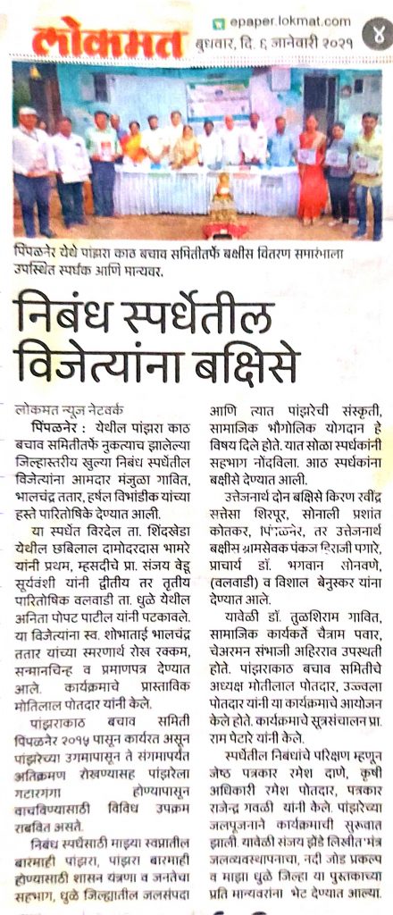 4) पांझरा खोऱ्यातील प्राचीन जल व्यवस्थापन व पीक पद्धती व सध्याच्या पांझरा खोऱ्याची स्थिती असे विषय देण्यात आले होते.यात खुप स्पर्धकांनी सहभाग नोंदविला. आठ स्पर्धकांना बक्षीस देण्यात आलेत.