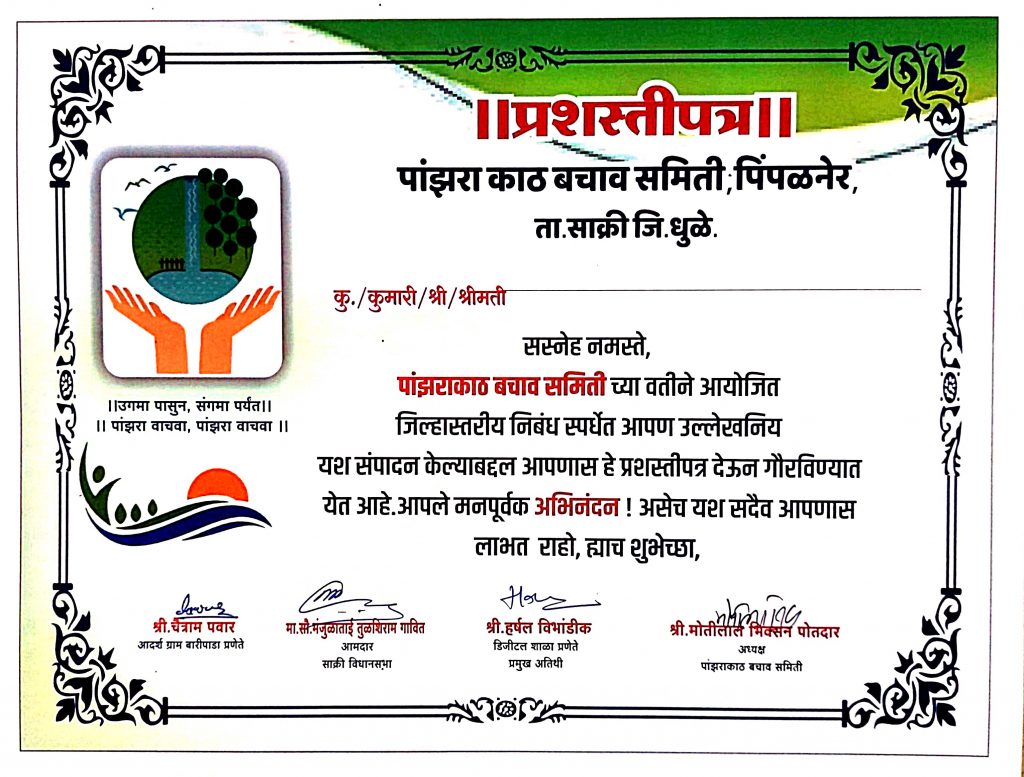 1) माझ्या स्वप्नातील बारमाही पांझरा व पांझरा बारमाही होण्यासाठी शासन यंत्रणा व जनतेचा सहभाग